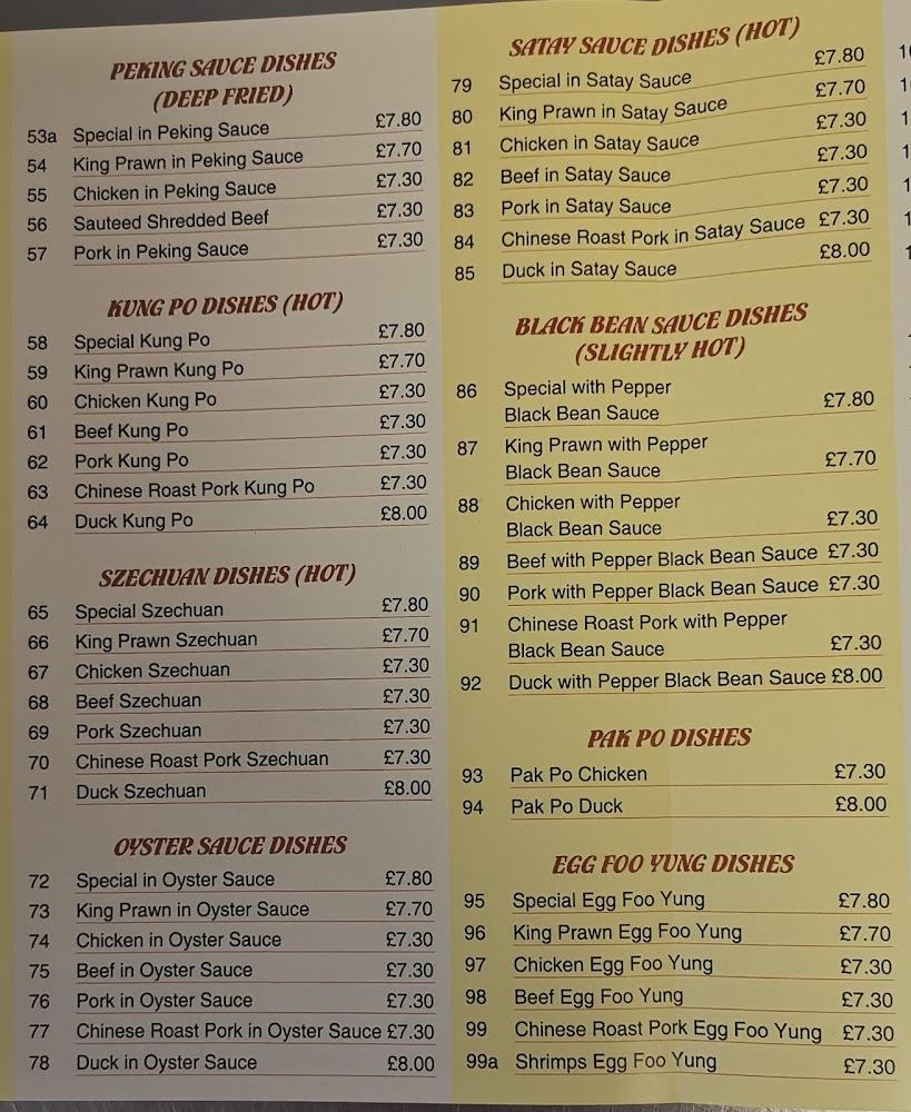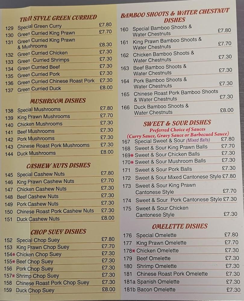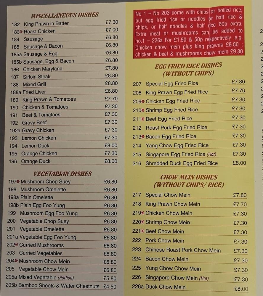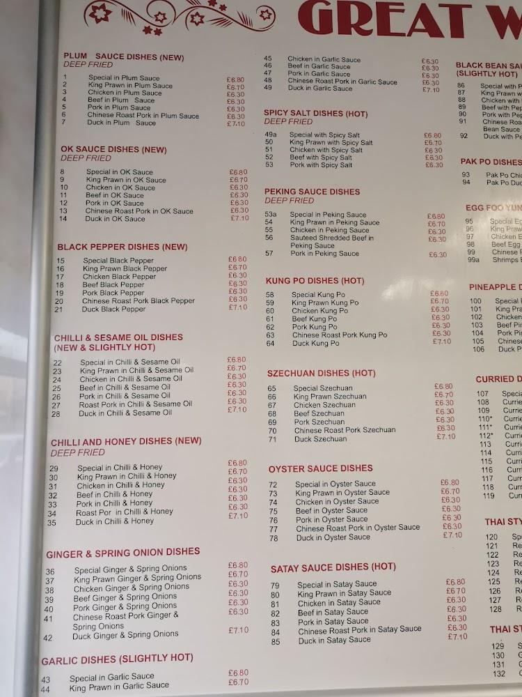 Great Wall features an extensive menu that caters to a diverse palate, including dishes from different categories such as Chow Mein, curries, and vegetarian options. The variety ensures there's something for everyone; with over 19 platters in the miscellaneous category alone, food choices range from King Prawn in Batter to Roast Chicken. Their Chow Mein selection includes several options such as Chicken and Beef Chow Mein, providing hearty meals. Vegetarians will appreciate the Mushroom Chop Suey and Omelette dishes. The Curries—both green and red—showcases authentic flavor profiles that are well-appreciated by spice lovers. Other popular options include the Sweet and Sour dishes and various Egg Fried Rice and noodle combinations, serving up hearty and fulfilling meals for any time of the day.